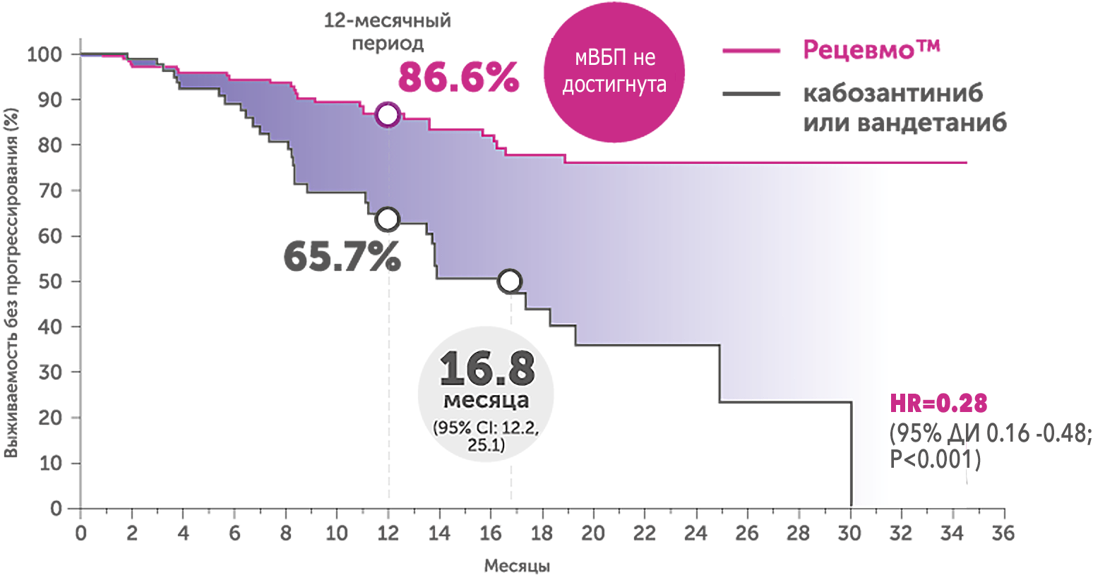 В группе селперкатиниба мВБП не была достигнута по сравнению с 16.76 мес. в группе кабозантиниба/вандетаниба (ОР 0.28 (95% ДИ 0.16 -0.48; P<0.001));