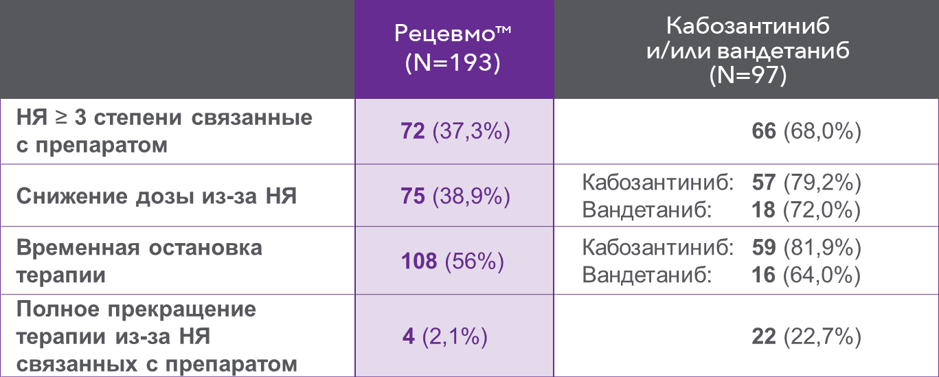 Частота отмены терапии из-за НЯ в группе селперкатиниба составила 2,1% против 22,7% в контрольной группе